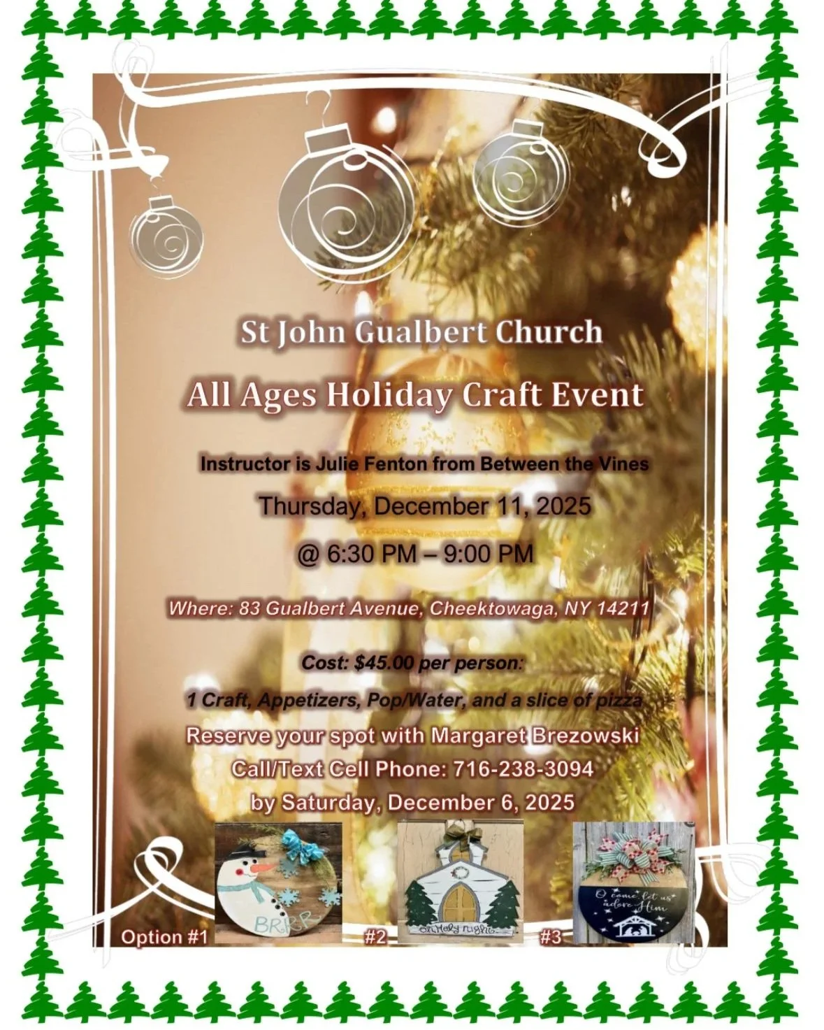 All Ages Holiday Craft Event | 6:30-9:00pm | St. John Gualbert Shrine - Join us women of St. Stans parish for an enjoyable evening together! We will be making wooden Christmas wreaths, guided by instructor, Julie Fenton, from Marilla, NY. Throughout the evening, 1 wreath, supplies, appetizers, drinks, and a slice of pizza will be provided. Cost is $45 per person.